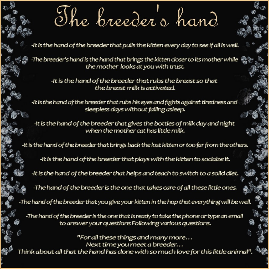 All our kittens are raised with tenderness and deserve attention and respect. It is for this reason that future families will be chosen with great care and vigilance to avoid "impulse" bookings and regretted purchases. This is in the best interests of our kittens, who want to be happy and pampered.